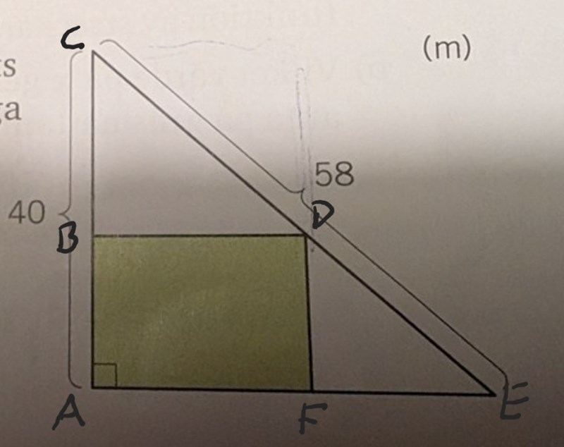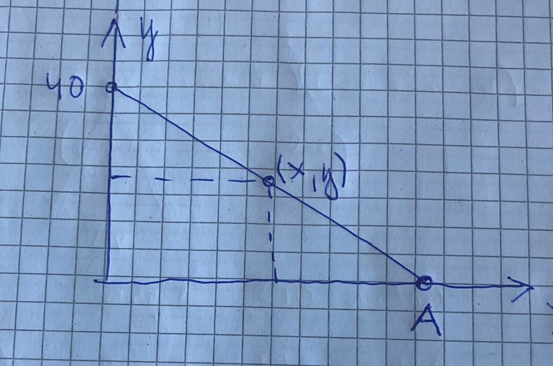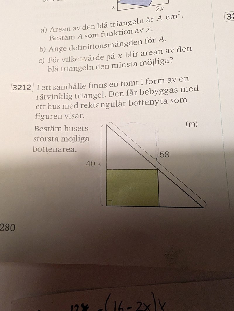 (Om du antar att formen är en kvadrat ger likformighet att x = 40*42/(40+42) 20,49, ett rent geometriproblem utan någon derivering. 42 är längden på AE. Men du har inte visat att detta x ger största arean.)