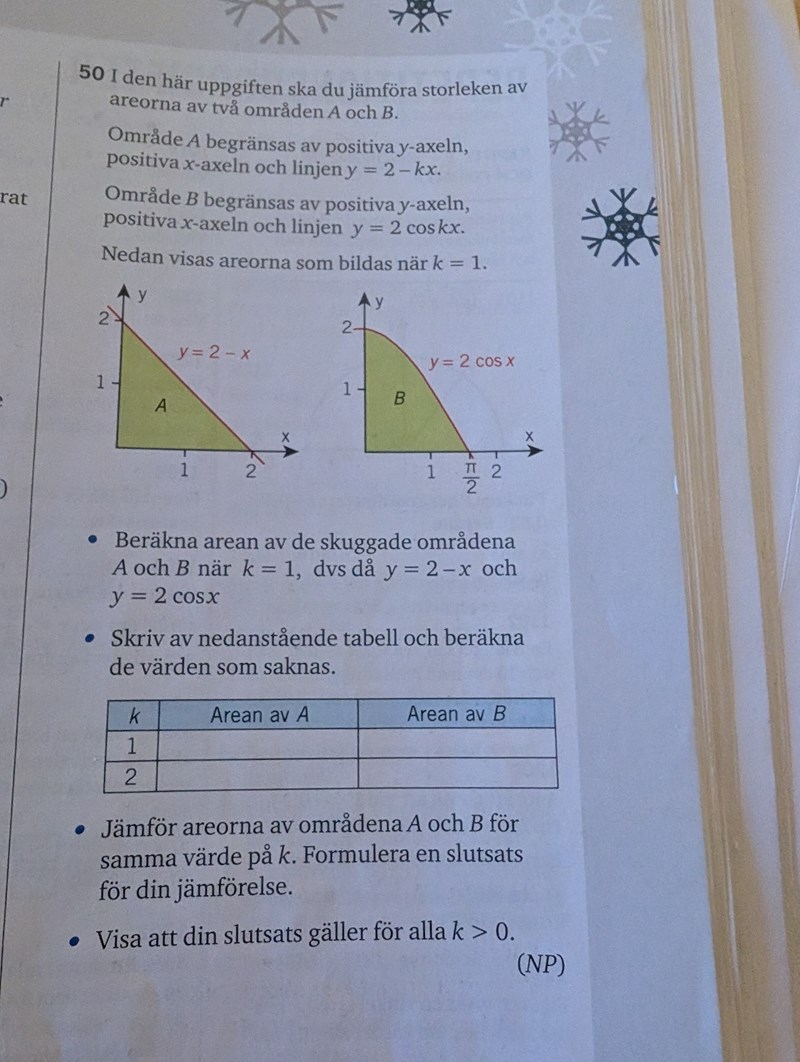 Men ja, man ska vara med då på att för ett annat k måste man räkna ut en ny skärningspunkt för X och det blir då andra inmatningsvärden för respektive funktion. Vilket är vad hela uppgiften handlar om, egentligen. Det missade jag dock fullständigt.