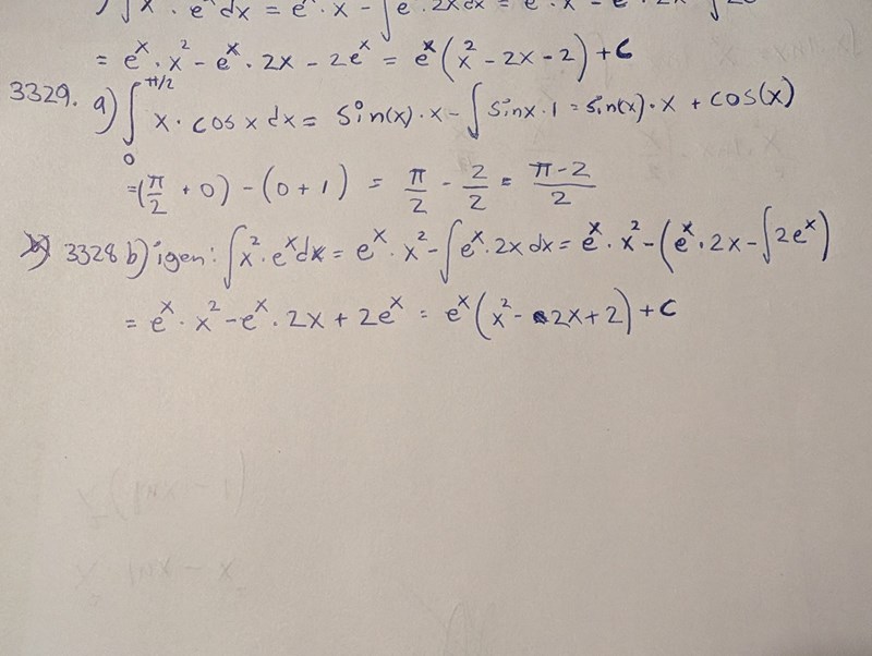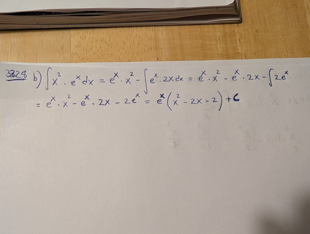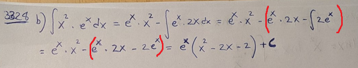 Måste vara försiktig med tecknena. Du tappar ett minustecken framför integralen i led 3. Minustecknet från det tidigare ledet slår på både ex2xe^x 2x och integralen, som redan har ett minustecken så det blir +.