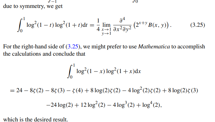 Efter det har jag, on and off, gjort problem i boken "Almost Impossible Integrals, Sums and Series". Den innehåller 60 st integraler och 60 st serier att beräkna. Problemen är ofta coola och trevliga men det har även funnits problem med tyngre beräkningar beräkningar. Ett exempel är när författaren själv i sitt lösningsförslag använder mathematica:Det är sant att högerledet är rätt jobbigt att räkna för hand och är generellt monotona beräkningar, men i så fall tycker jag att man kanske ska undvika att ha med sådana problem.