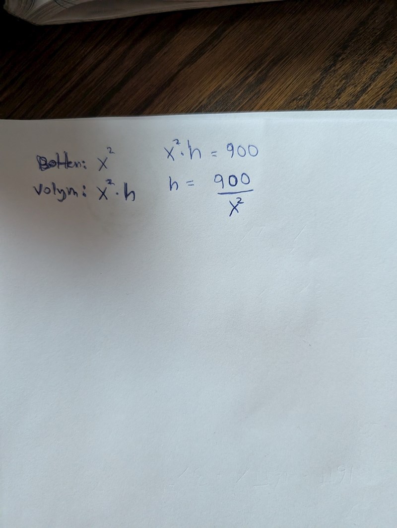Om du låter både x och h anges i cm så är bottenarean x2 och den sammanlagda arean av de vertikala väggarna 4•xh, vilket med hjälp av din omskrivning blir 4•x•900/x2 = 3600/x.