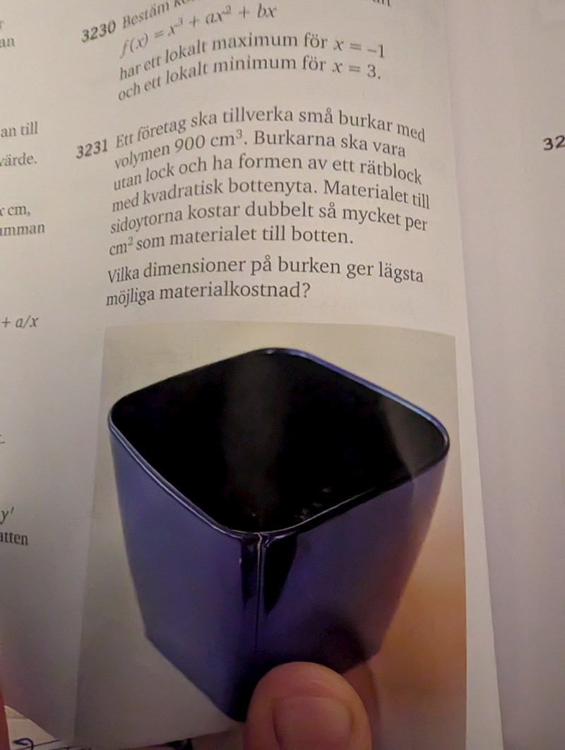 Kostnaden för en burk, dvs det uttryck du ska minimera, blir då f(x) = px2+2p•3600/x = p(x2+7200/x), där p är den konstanta kostnaden i kronor per cm2 för materialet i botten.
