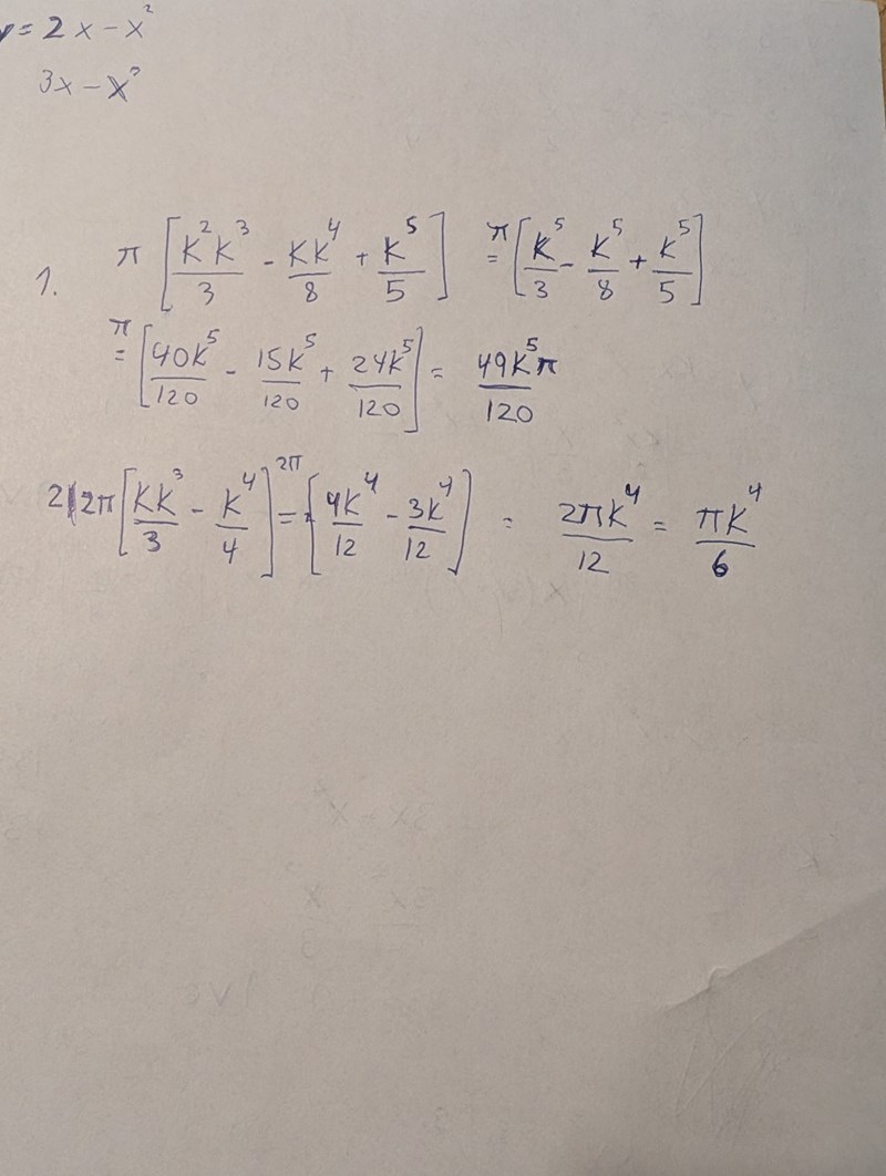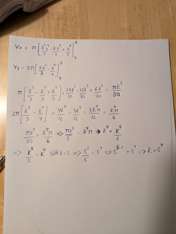 Jag satte godtyckligt K = 3 och tänkte räkna ut båda volymer och sedan kolla vad kvoten blev mellan dem och sedan öka på K med kvoten. Men det hade kanske blivit fel. I vilket fall blev det väldigt rörigt.