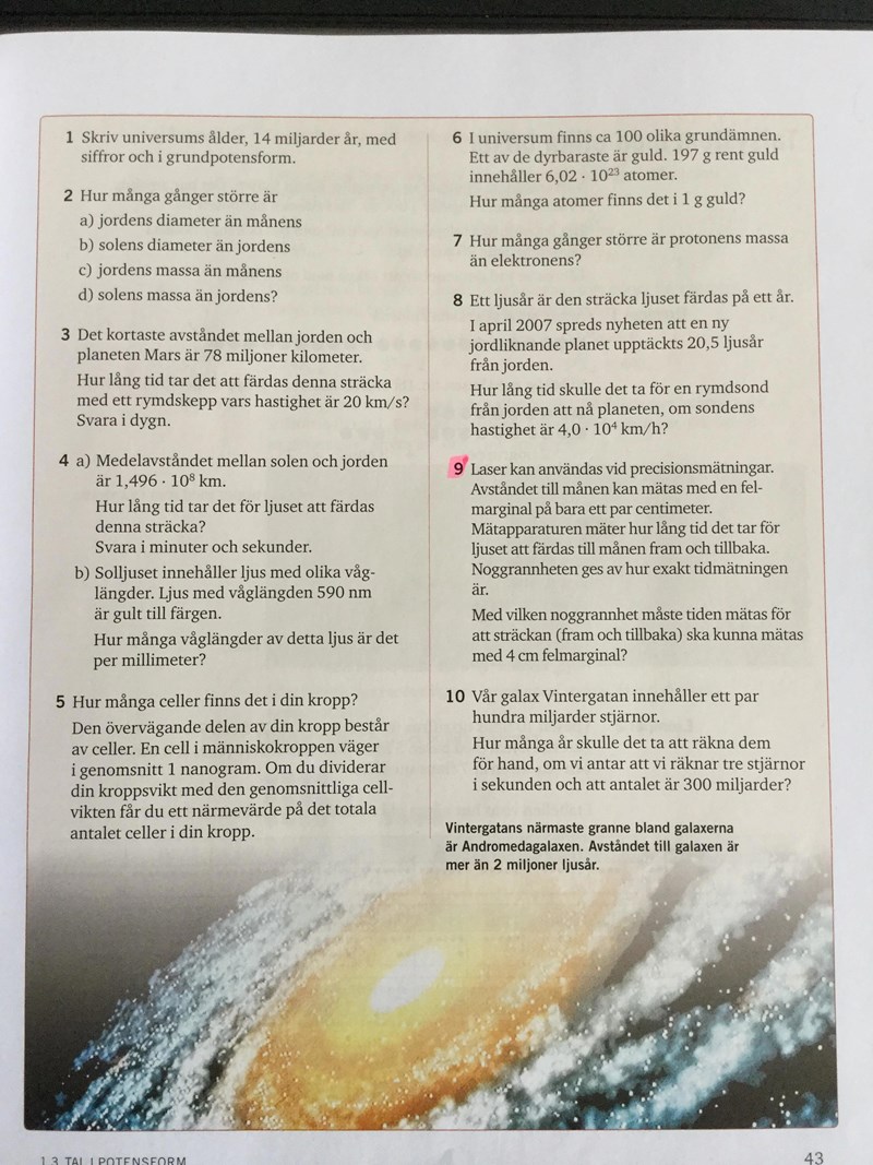 Fråga 9 gäller hur noggrannt man måste kunna mäta tid för att mäta avståndet till månen och inte mäta fel på mer än 4 cm.