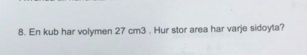 För att få arean gångrar jag längden och bredden och vi vet att båda sidorna är lika stora och att de är 3 cm då blir det 3x3= 9