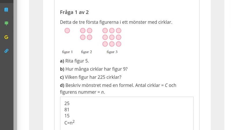 Det är ett mönster där formeln är N2(Numret upphöjt till två). Jag undrar hur man kan använda formeln och en summa för att få numret som gånger sig själv blir 225 (vet att det är 15 men förstår inte hur man räknar ut med en formel).