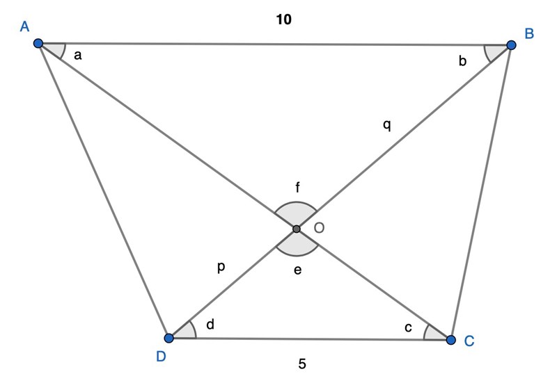 2. Fyrhörningen ABCD är ett parallelltrapets, där AB || CD. Diagonalerna AC och BD skär varandra i punkten O. Om , och längdenheter, beräkna och ange längden av sträckan DO.