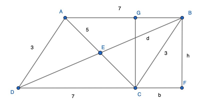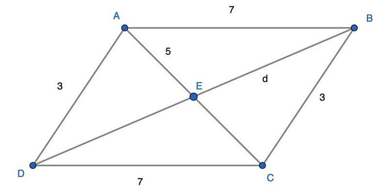 30. En parallellogram har sidlängder 3 och 7 (längdenheter). Om den ena diagonalens längd är 5 (längdenheter), beräkna och ange den andra diagonalens längd.