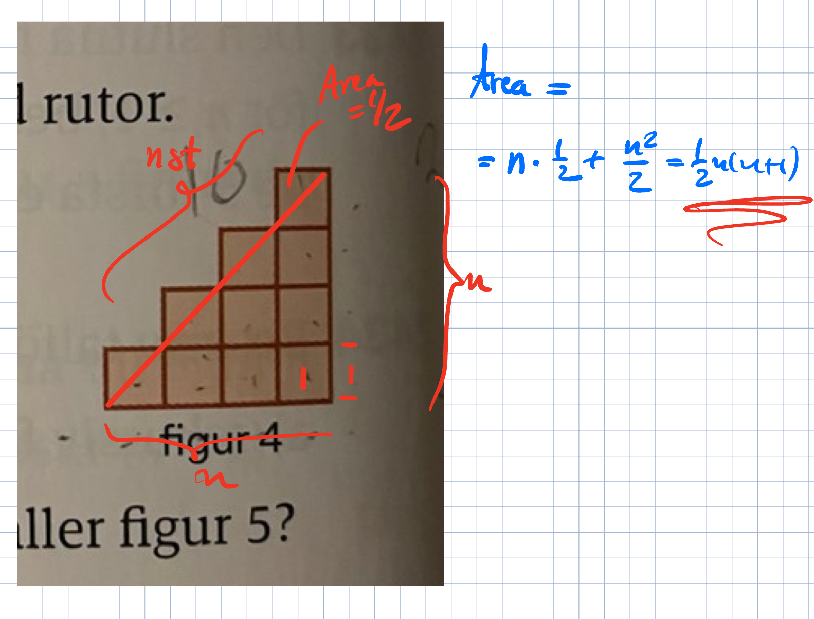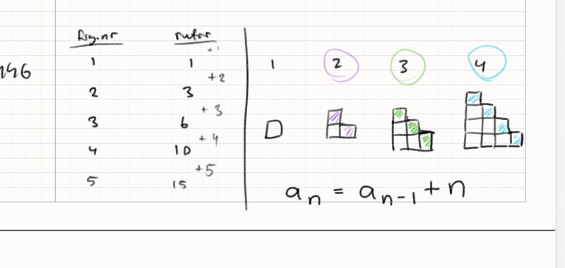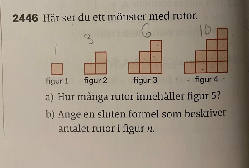 Jag har suttit och klurat på den här uppgiften i över en timme och förstår verkligen inte hur jag ska göra en sluten formel av detta mönster. Facit visar svaret an=(n(n+1))/2 men jag vet inte hur jag tar mig dit på egen hand. Tack så mycket på förhand för hjälp!