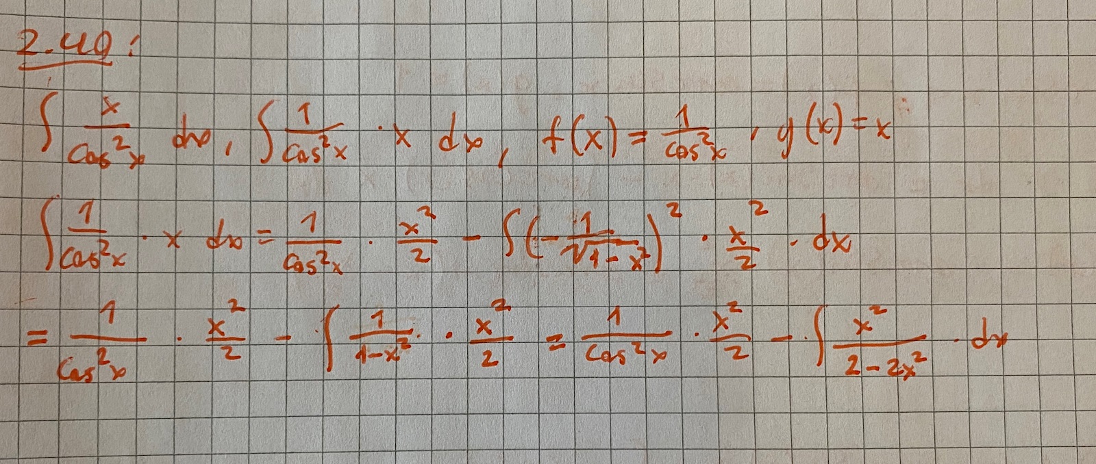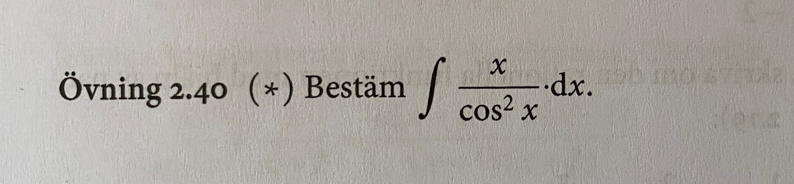 Hej! Behöver hjälp med följande uppgift. Kommer inte längre än bilden nedan visar. Hur bör jag göra för att komma framåt? Svaret ska bli: ln(cos x) + x*tan(x) + c
