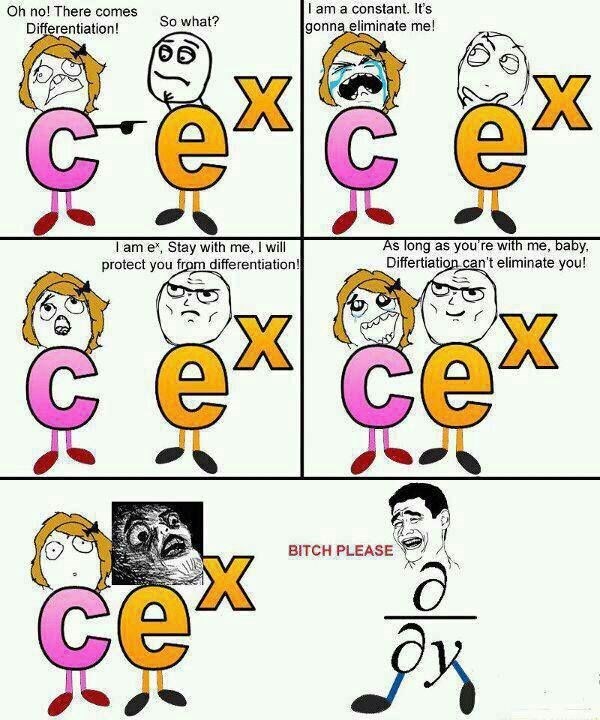 Det var en gång två funktioner som var ute på promenad. Plötsligt bleknade . "Vad är det? undrade . "Jag såg en deriveringsoperator där borta, och om jag träffar den tre gånger, så försvinner jag!" svarade . "Äsch, jag är inte rädd!" sa . "Jag går bort och snackar lite med den."