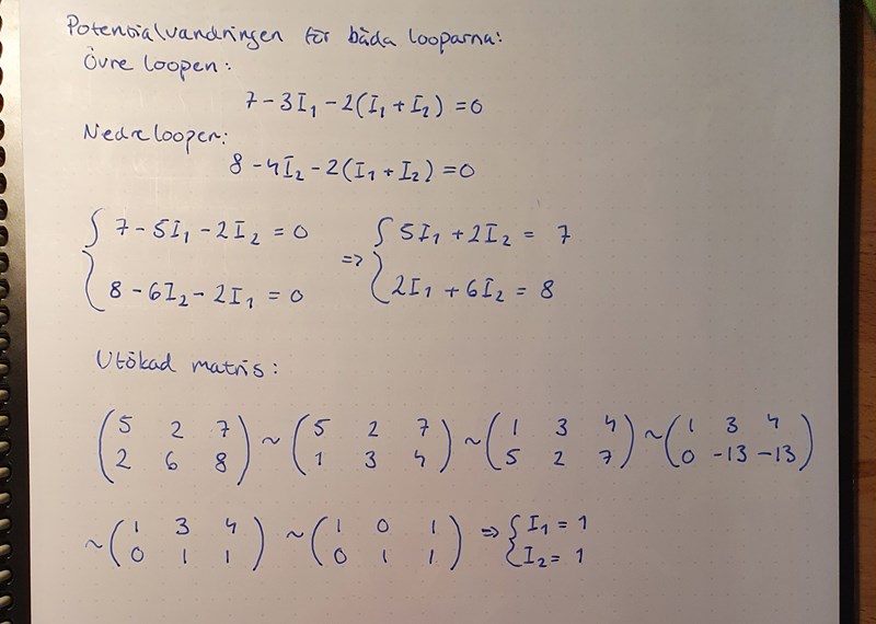 Lös för I1 och I2. Bestäm strömmen genom varje motstånd baserat på de framräknade värdena på loopströmmarna.