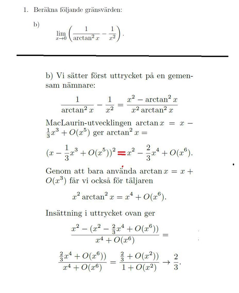 Jag håller på att försöka lära mig att hitta gränsvärden m.h.a. MacLauringutveckling. Jag har hittat ett exempel nedan där det finns ett rödmarkerat beräkningssteg jag inte förstår som jag som jag hoppas ni kan hjälpa mig med.