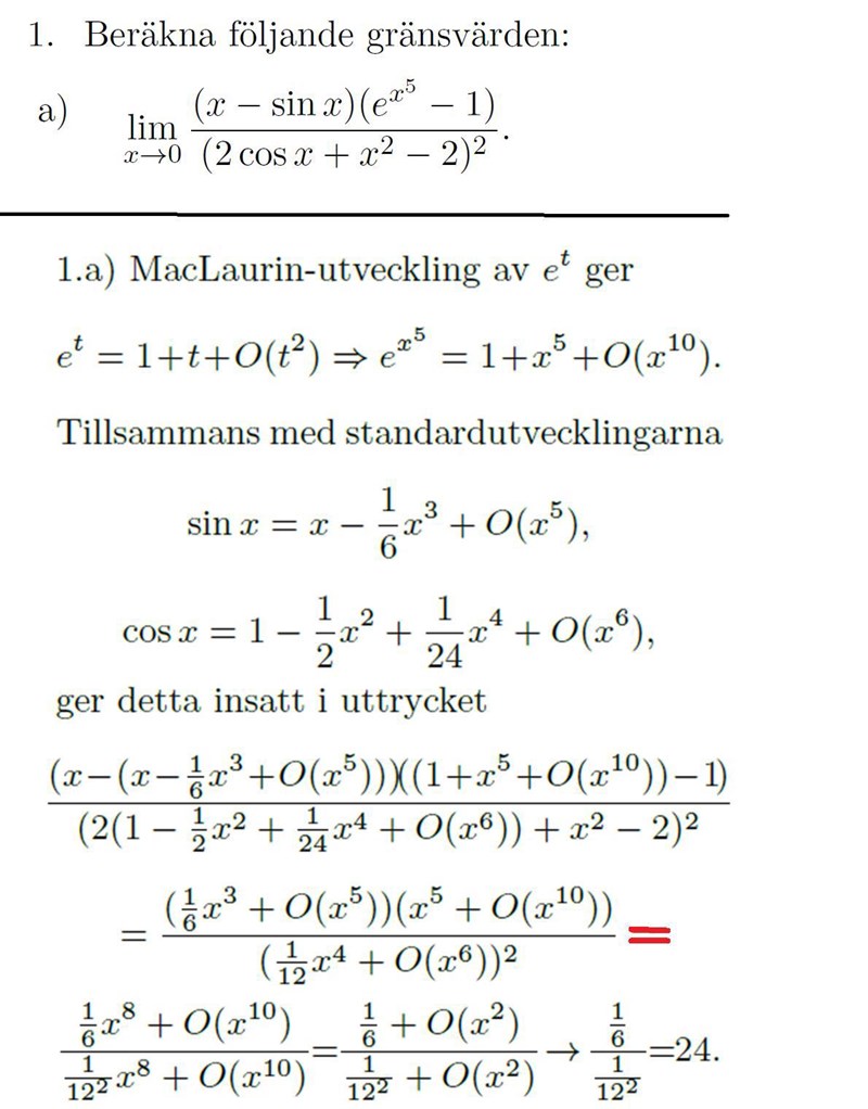 Jag håller på att försöka lära mig att hitta gränsvärden m.h.a. MacLauringutveckling. Jag har hittat ett exempel nedan där det finns ett rödmarkerat beräkningssteg jag inte förstår som jag som jag hoppas ni kan hjälpa mig med.