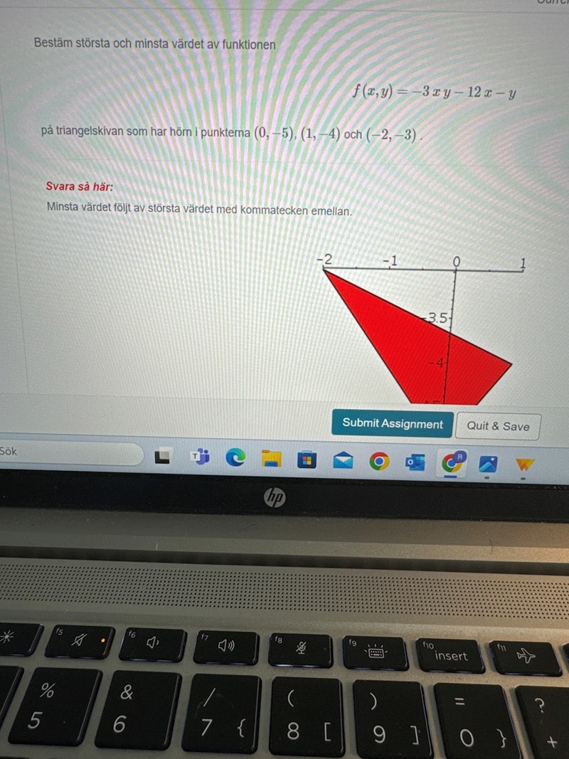 Är det du som har ritat triangeln? Den stämmer inte med uppgiften - det skall inte vara något hörn i punkten (-2,0), däremot i punkten (-2,-3).