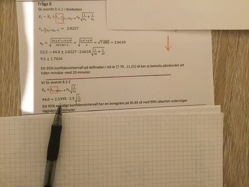 Hej jag har bara en fråga ang uppgift b) jag ser att man har räknat så 1-0,99=0,01 tagit fg=19 som ger 2,5395 från Tabellen? Varför tar man just denna värde? 🤔🙏🏽 Om man läser uppgiften så står det att det understiger 46 minuter ? Har det ett samband med detta och gjora ..snälla kan ni förklara 🙏🏽🙏🏽🙏🏽