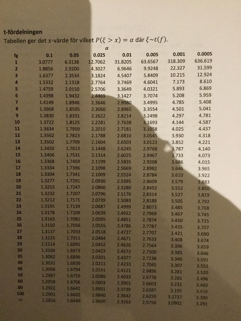 vi vet att 1-0,95 = 0,05 är det så att vi tittar på t-fördelning Tabell kolum 0,05 men vilket värde är det vi tar från Tabellen ?