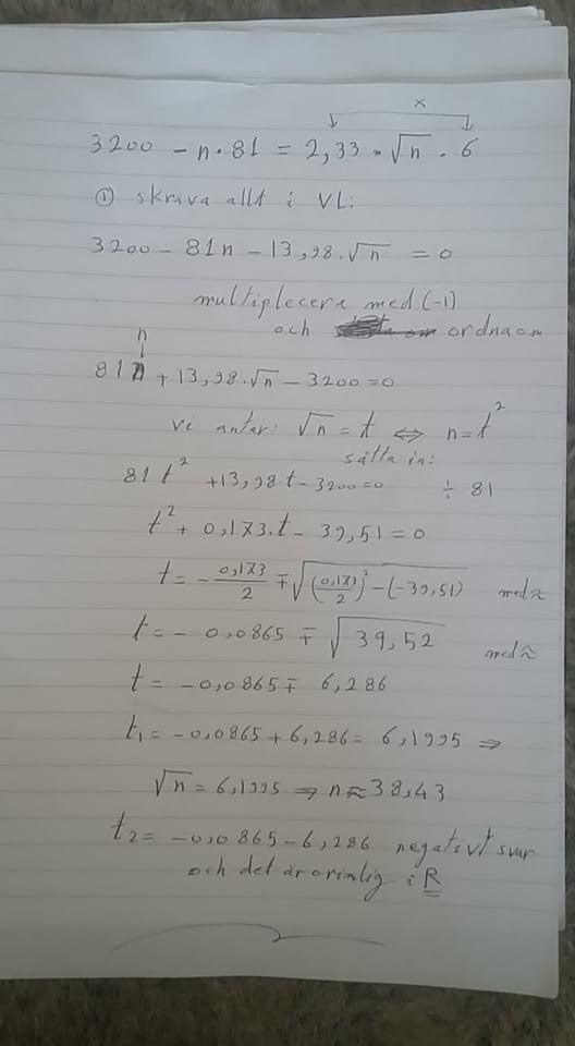 Det värde på phi som uppfyller att Φ(a)=0,99\Phi(a)=0,99 är a=2,33a=2,33. Vi vet med andra ord att 3200-n·81n·6\frac{3200-n\cdot81}{\sqrt{n}\cdot6} ska vara lika med a=2,33a=2,33. Vi löser ut n ur denna ekvation, och då får vi att n=38,4362n=38,4362