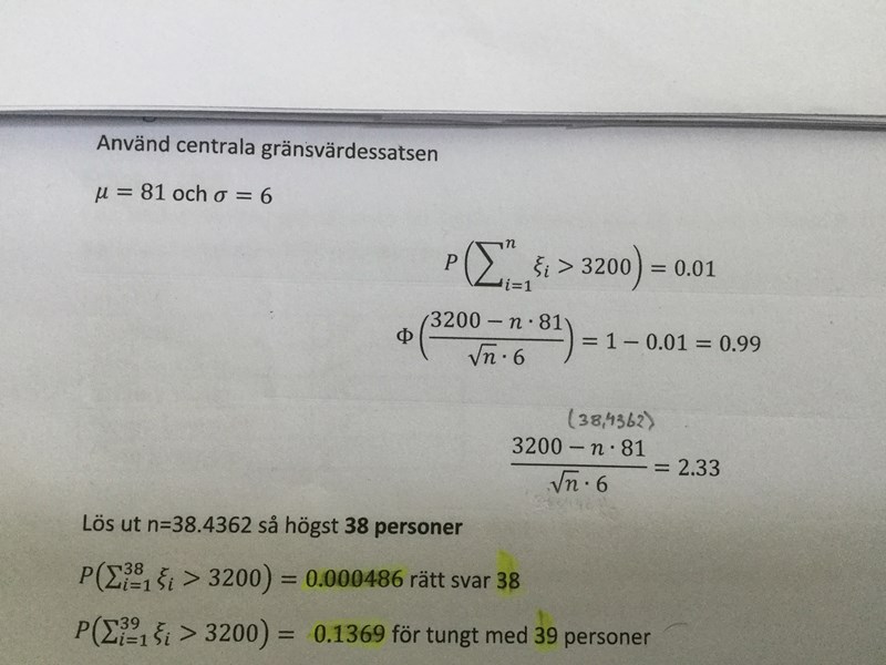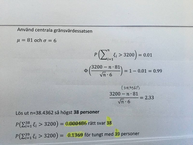 Eftersom människor inte kommer i bråkdelar får vi avrunda nedåt till 38. För att vara extra säkra beräknar vi nu Φ(3200-n·81n·6)=0,99\Phi(\frac{3200-n\cdot81}{\sqrt{n}\cdot6})=0,99 för n=38n=38 respektive n=39n=39, och får då sannolikheterna 0,000486 respektive 0,1369. Vi har alltså bekräftat att 39 personer blir för tungt, men att 38 personer fungerar.