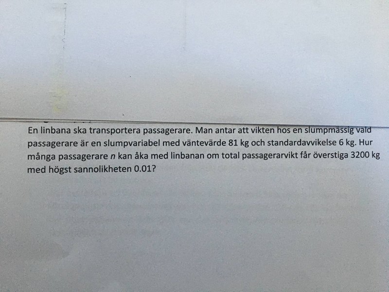 Vi har ett stort antal stokastiska variabler med ändlig varians, vilket gör att vi kan använda centrala gränsvärdessatsen. Vi vill hitta antalet personer, n, som kan åka med linbanan utan att överstiga 3200 kg, med 99% säkerhet. Vi vill alltså beräkna sannolikheten att summan av vikterna ska uppfylla att P(vikter>3200)=0,01P(\sum\mathrm{vikter}>3200)=0,01.