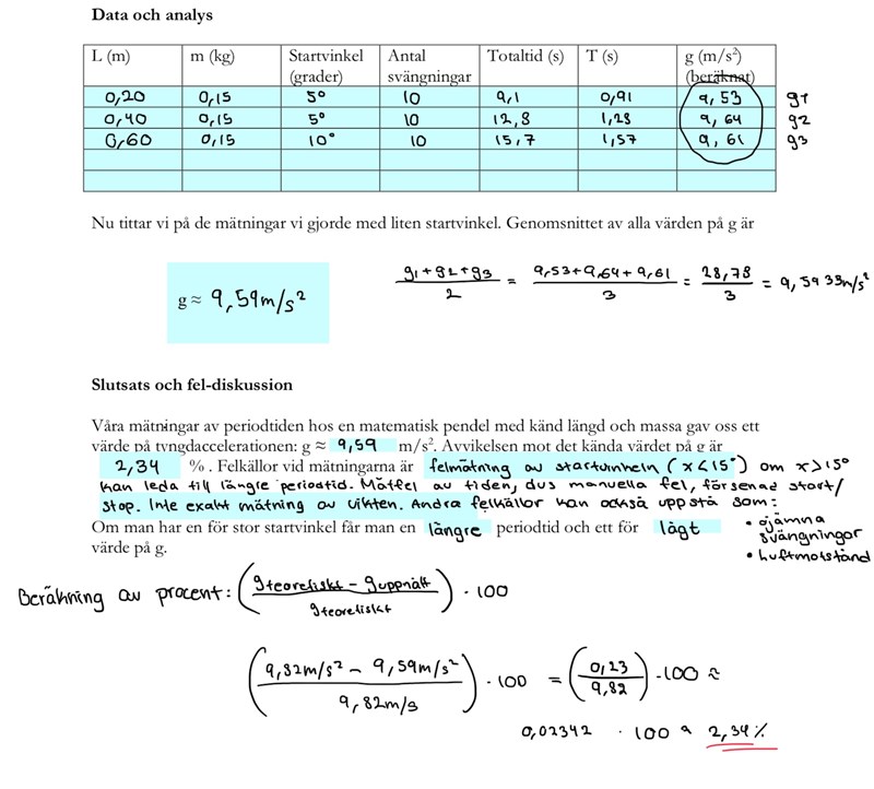 A) Hur exakt har du mätt längd och totaltid? Är tre värdesiffror i ditt uppskattade värde för g rimligt? Gissningvis har du använt denna formel: