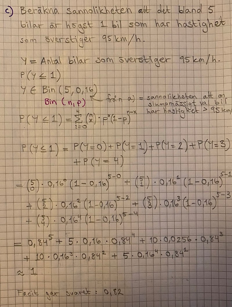 Skriver du att sannolikheten att det är högst 1 bil som kör för fort är (sannolikheten att 0 bilar kör för fort) + (sannolikheten att 1 bil kör för fort) + (sannolikheten att 2 bilar kör för fort) + (sannolikheten att 3 bilar kör för fort) + (sannolikheten att 4 bilar kör för fort)? Du verkar ha räknat ut sannolikheten att högst 4 bilar klr för fort.