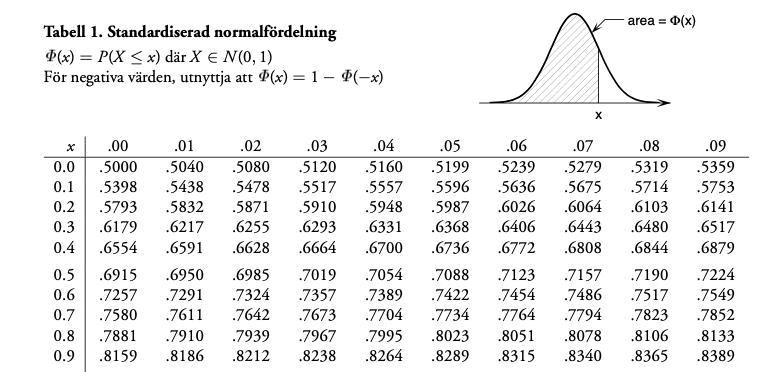 Hmm..Jag får 9.6 istället för 9.2 som är svaret. I Z tabellen hittade jag 0.85 som 0.823 och räknade sedan: 11,214 -(0.823*1.9) = m = 9.6... Vad gör jag för fel? Är de fel tabell?