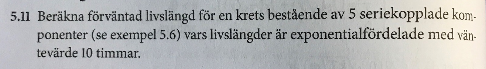 En lampas livslängd (T) är exponentialfördelad med väntevärde 10 timmar. Det innebär att fördelningsfunktionen för en lampas livslängd är , där t är tiden lampan brinner. Sannolikheten att en lampa brinner i mindre än tio timmar är då .