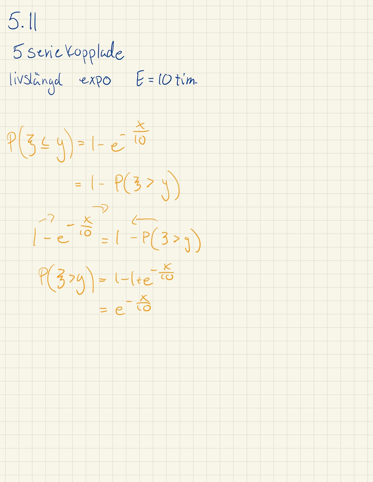 Smutstvätt skrev:En lampas livslängd (T) är exponentialfördelad med väntevärde 10 timmar. Det innebär att fördelningsfunktionen för en lampas livslängd är , där t är tiden lampan brinner. Sannolikheten att en lampa brinner i mindre än tio timmar är då .
