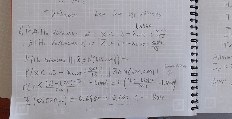 Jag tänker att detta är komplementet till beta p.g.a. just att vi upptäcker att μ understiger 1.3 och därförförkastarH0. D.V.S. vi söker 1-β.