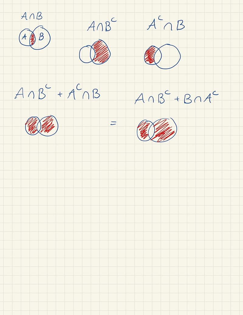 4 och 5. Det finns ingen operation i mängdalgebran som har beteckningen+. Du har bara union, snitt och komplementbildning. Om ditt + betyder union så tror jag Wenndiagrammen där stämmer och då kallas detta för att "Den symmetriska differensen".