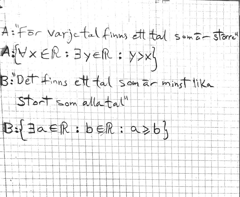 Om mängden är R så är b falsk, men stod det verkligen i frågan vilken mängd det gällde?