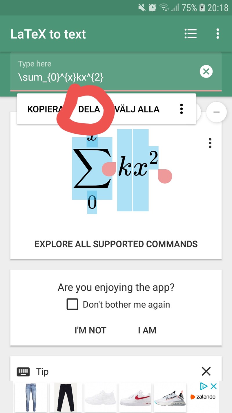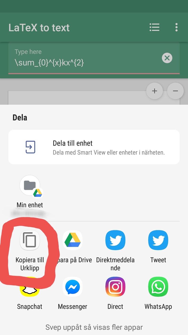 Tipset fungerar vid kopiering av LaTex-kod, som \sum_{0}^{x}kx^{2} (med dubbeldollar).
