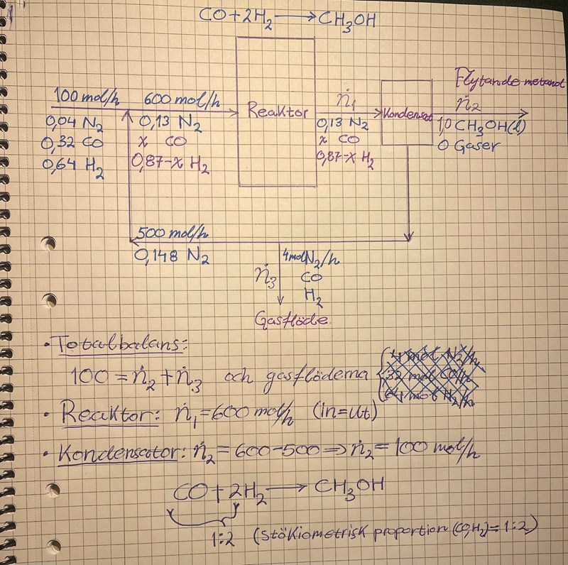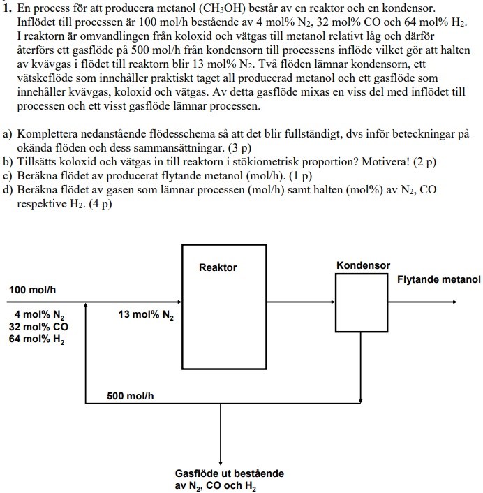 Följande materialbalansuppgift handlar om tvåenhetsprocess med bypass. Jag har lite svårt att få fram en ekvation för totalbalans av flöden (in=ut) då jag vet inte vad jag ska anse som (total)inflöde? Mina ekvationer verkar inte riktigt stämma, men vill gärna höra vad jag har möjligtvis gjort fel och vad som krävs för att lösa uppgiften?