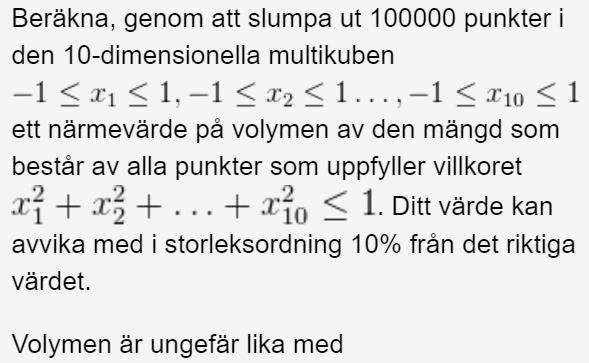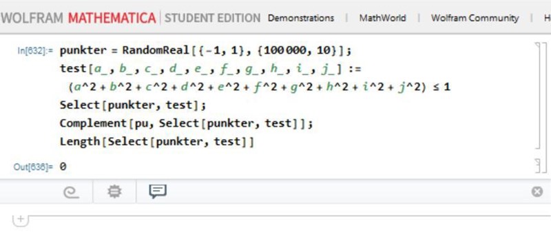förstår att detta inte ger svaret men får inte ens ut hur många av de random selected punkter som ligger innanför criteriet? Varför blir det bara noll?