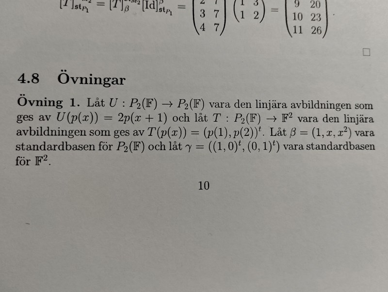 Jag försöker skriva matrisen för U relativt basen och tänker då att jag ska sätta in basvektorerna, en och en, i avbildningen, men jag förstår inte riktigt var? Jag gjorde såhär: