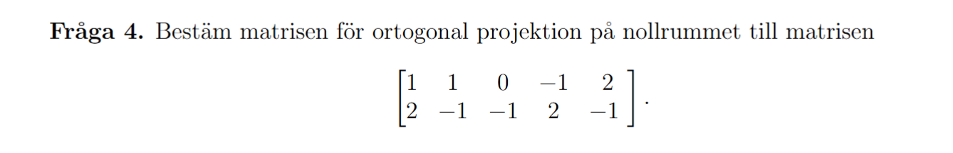 Ta först fram en bas (Ei) för nollrummet. Använd Gram Schmidt för att ta fram en ON-bas (ei) baserat på (Ei).