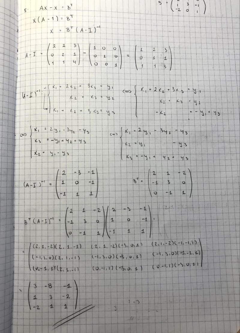 Jag har inte kollat hela lösningen, för det blir fel direkt på rad två. För två matriser och så gäller i allmänhet inte att . Man säger att matrismultiplikation inte är kommutativ.