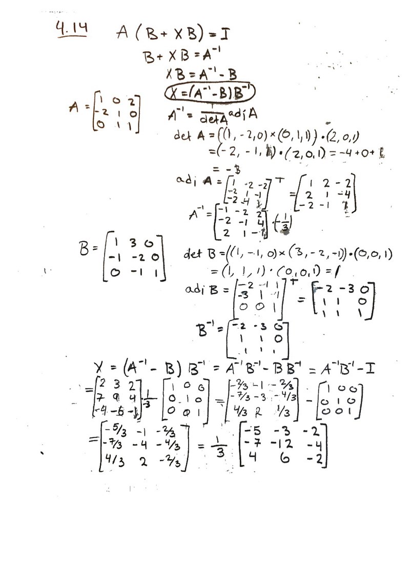där A och B är matriserna som syns på uträkningen. Jag trodde att jag hade räknat rätt, men får fel svar enligt facit. Jag har dubbelkollat inversmatriserna online samt matrismultiplikationen A-1B-1. Därmed antar jag att det är något fel på hur jag skriver om A(B+XB)=I till X=A-1B-1-I