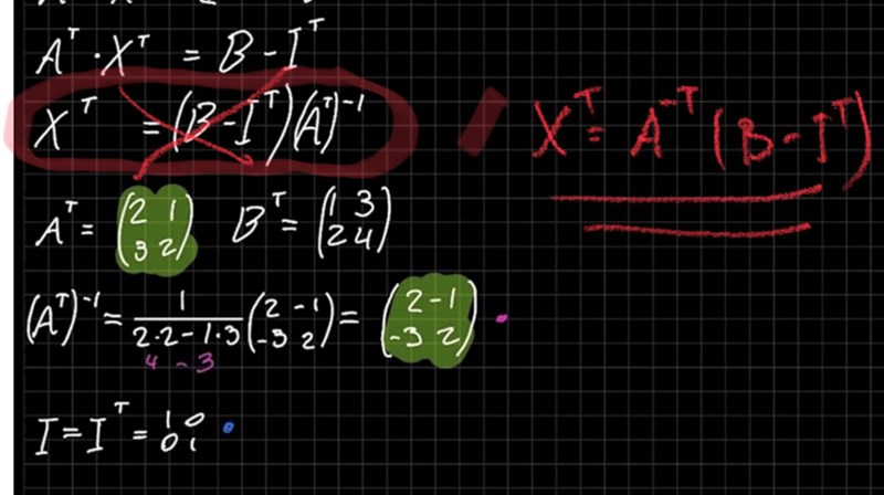 Tänkte vidare på att matriser är ordningskänsliga och testade A^T = (B-I^T) skalärt (X^T)^-1 vilket ger -3 1 / 6 0