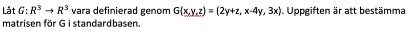 Jag får matrisen i standardbasen. Då har jag bara tagit koefficienterna från (2y+z, x-4y, 3x). Vet inte om jag missuppfatta genomgången men har för mig att det här är allt som behövs göras? Om det är rätt, kan nån förklara med ord vad som har gjorts blir förvirrad av det simpla svaret.