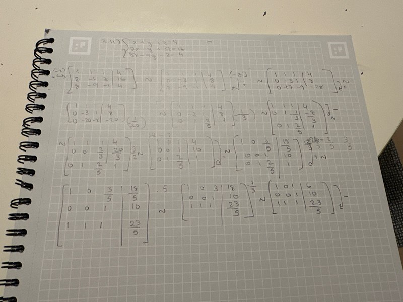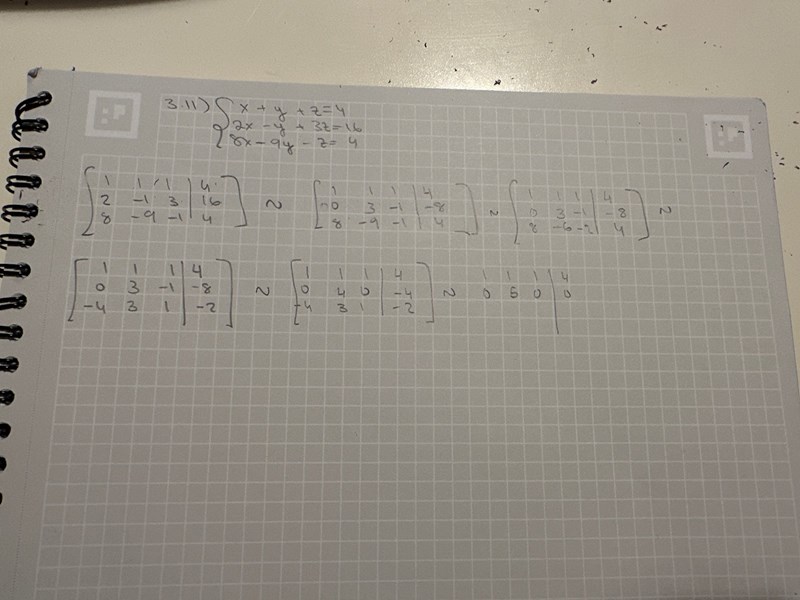 Här försöker jag lösa ekvationssystemet nedan med gausselimination men jag är fast och känner att jag inte kommer framåt :) Hade upskattat lite råd om hur jag kan gå vidare med min lösning! Tack på förhand