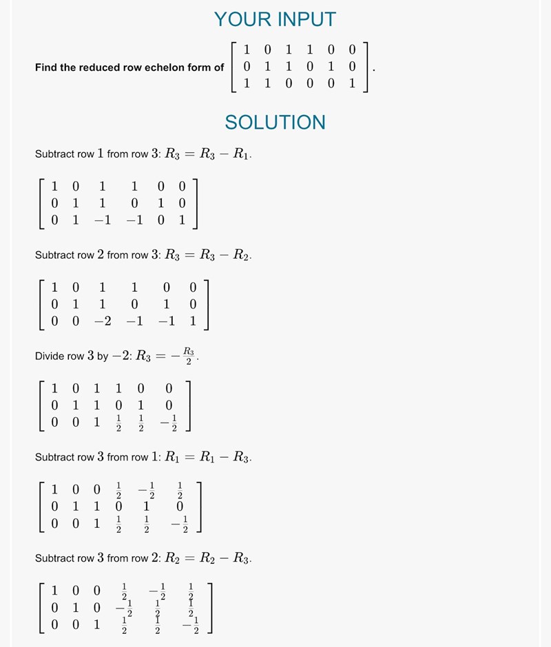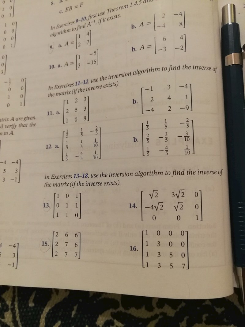 "The inversion algorithm To find the inverse of an invertible matris AA, find a sequence of elementary row operations that reduces AA to II, and then perform the same sequence of operations om II to obtain A-1A^{-1}"