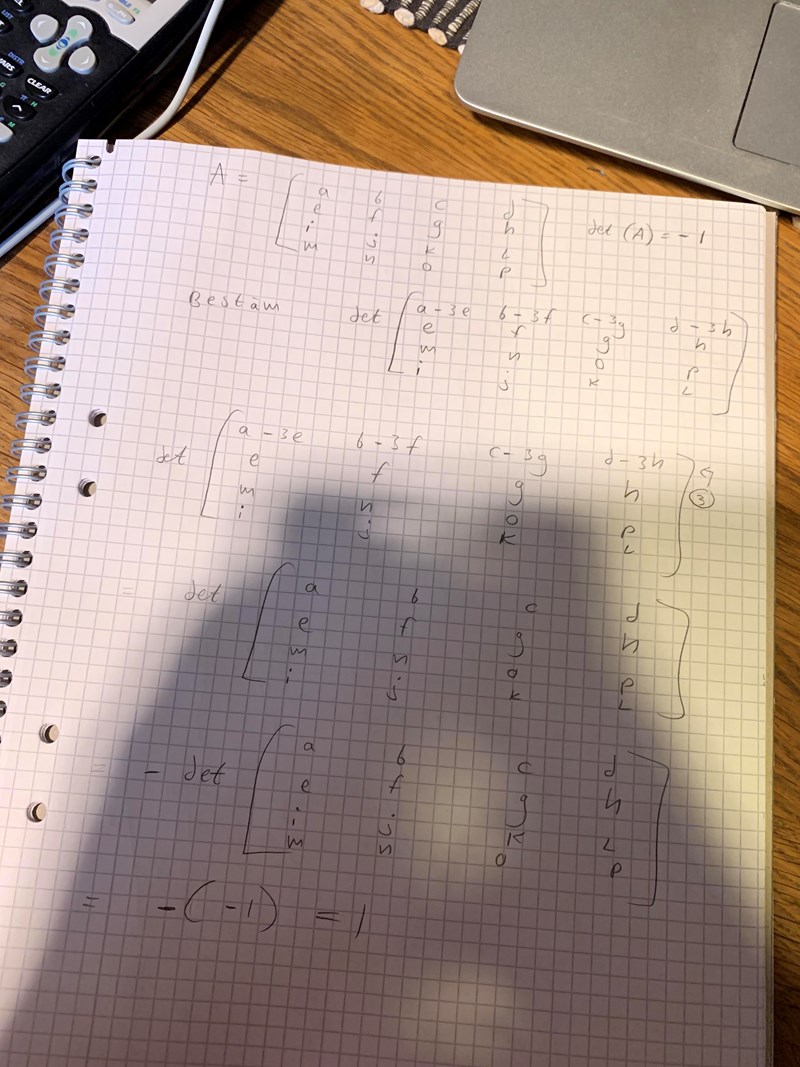 Hej jag undrar om jag har tänkt rätt på denna uppgift, visste hur matrisen A såg ut samt var det(A) var lika med. Bilden nedan visar vad jag ville bestämma, samt hur jag utförde beräkningen. Stämmer detta?