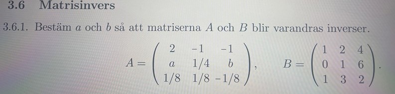 Välkommen till Pluggakuten!! Två matriser är inverser om de uppfyller att AB=BA=IAB=BA=I, där I är identitetsmatrisen. Vad blir AB och BA i detta fall? :)