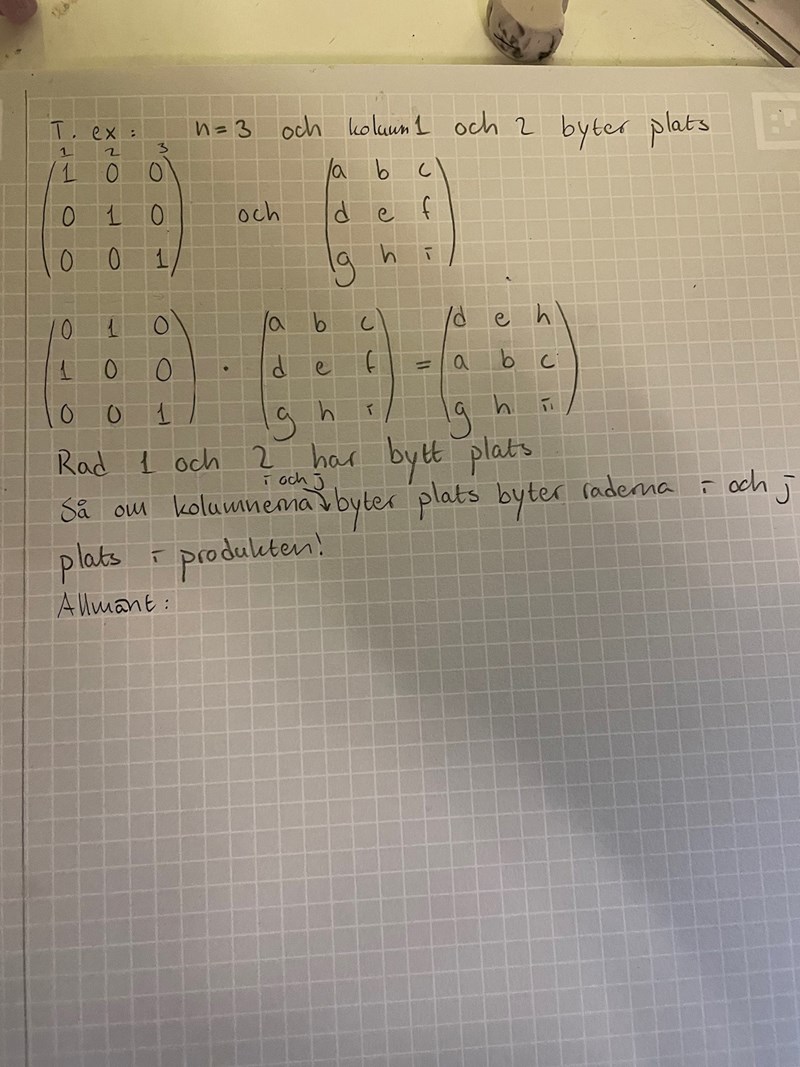 Hej, jag håller på med uppgift 2,7. Jag har gjort ett exempel och inser att raderna i och j kommer byta plats i produkten, men jag behöver få det lite mer allmänt. Hur ska jag tänka då?