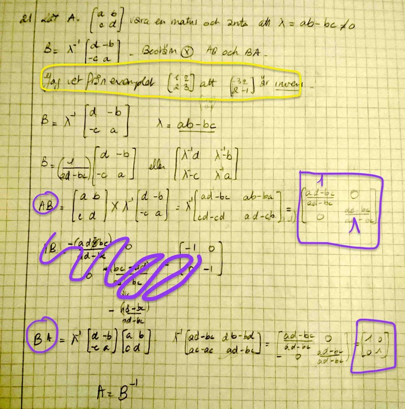 2. Vid multiplikation av matris och skalärer (tal) så spelar ordningen ingen roll. Däremot spelar ordningen av matriser roll generellt sätt. Undantaget till det är just inversa matriser som vid multiplikation alltid blir enhetsmatrisen, oavsett mult.ordning.