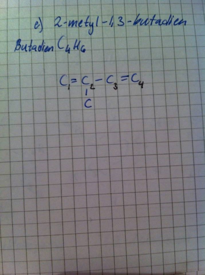 På e) är uppgiften, Kautschuk, dvs. polymeren som bildas av monomeren 2-metyl-1,3-butadien.