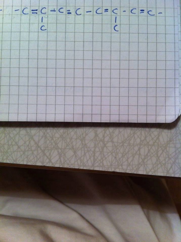 Tyvärr klarar jag inte att posta bilder från min urgamla mobil. Men om två kloreten reagerar med varandra får du molekylen -CHCl-CH2-CHCl-CH2- och reagerar fler kloreten med varandra, så får du en längre (ogrenad) kedja.