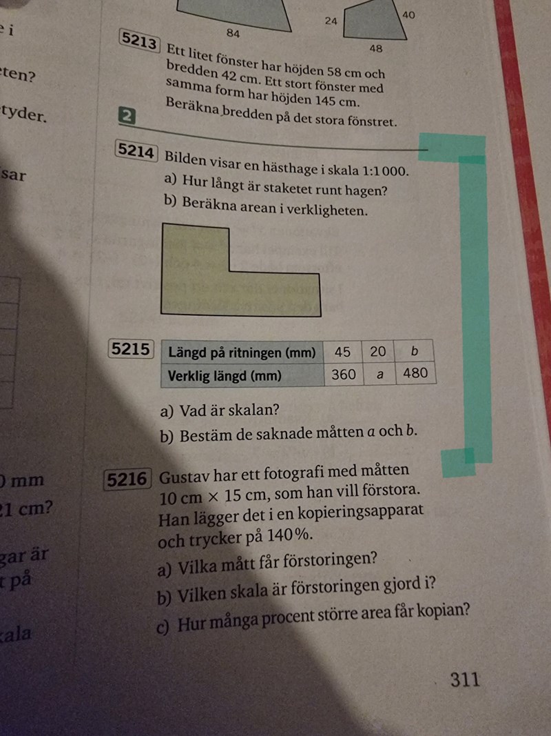 b) Areaskalan är (1:1000)2. Beräkna arean på figuren och multiplicera med 10002